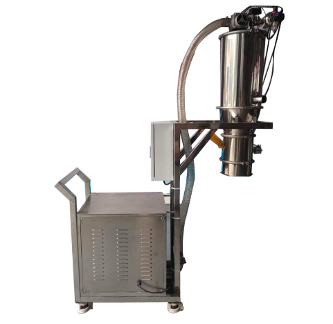 真空上料機(jī)是用真空泵抽氣,使吸料嘴進(jìn)口處及整個系統(tǒng)處于一定的真空狀態(tài),粉粒料隨同外界空氣被吸入料嘴,形成料氣流,經(jīng)過吸料管到達(dá)料斗,在料斗中進(jìn)行氣、料分離。分離后的物料進(jìn)入受料設(shè)備。輸送、放料是通過氣動三通閥不斷地開、閉來完成的,而氣動三通閥的開閉是由控制中心來控制的。 ZKS 真空上料機(jī)中裝有壓縮空氣反吹裝置,每次放料時,壓縮空氣脈沖反吹過濾器,把吸附于過濾器表面的粉末打落下來,使吸料能正常運(yùn)行。